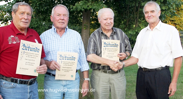 Aschaffenburg, Schweinheim. BSC Schweinheim Zu Ehrenmitgliedern ernannt wurden von links: Siegbert Pfeiffer, Otto Appelmann und Theo Stahl von dem BSC Vorsitzenden Hans-Joachim Treubert Foto: Christine Blume-Esterer