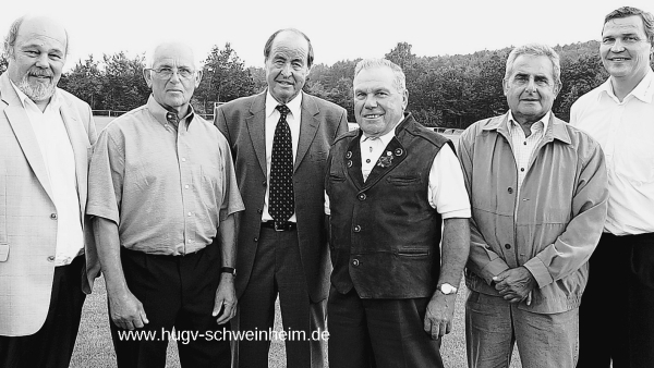 Ehrungen beim BSC Schweinheim. Anlässlich der Jubiläumsfeier wurden fünf langjährige Mitstreiter zu Ehrenmitgliedern ernannt (von links): Vorstandsmitglied Theodor Bubenzer, Karl Soder, Kurt Kolb, Friedbert Brunner, Edgar Maier und Vorsitzender Peter Staudt. Ehrenmitglied Alfons Leeb fehlte beim Fototermin. Foto: Christine Blume-Esterer